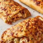 Divide your pizza dough into two equal portions. On a lightly floured surface, roll each piece out until it’s roughly 1/4 inch thick—that’s thinner than pizza dough but sturdy enough to hold the filling. Spread half of the Caesar dressing over one rolled dough, then layer on half the chopped chicken, bacon, mozzarella, Parmesan, and green onions. Repeat with the other piece of dough and remaining ingredients.