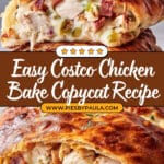 This Costco Chicken Bake Recipe replicates the popular bakery item with a homemade twist. It combines crispy bacon, Italian-seasoned chicken, creamy Caesar dressing, mozzarella, and Parmesan cheeses, all wrapped inside a soft, golden-baked pizza dough roll. Perfect for a hearty appetizer or main dish, this recipe balances savory flavors with a satisfying texture that’s sure to please friends and family.