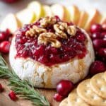 This Cranberry Baked Brie recipe features a warm, creamy 8-ounce round of brie cheese baked to perfection and topped with tangy cranberry sauce and optional chopped walnuts. It’s an easy, elegant appetizer perfect for holiday gatherings, served with crackers, pita bread, breadsticks, or fruit.