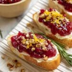 - Top and serve: Spoon a generous amount of chilled cranberry chutney onto each Brie-topped crostini. Sprinkle with chopped pecans, additional orange zest, and add a rosemary sprig for an optional aromatic garnish. Serve immediately to enjoy the warm melted cheese with the cool, flavorful chutney.