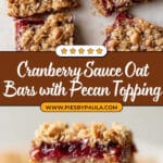 Delicious cranberry sauce oat bars featuring a buttery oat crust, a tangy cranberry sauce layer, and a crunchy pecan oat topping. Perfect for using up leftover cranberry sauce and ideal for a sweet snack or dessert.