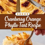 This Cranberry Crinkle Tart is a delightful holiday dessert featuring crisp, buttery phyllo dough layered and baked to golden perfection, filled with a smooth orange custard punctuated by bursts of tangy cranberry sauce. The tart is finished with a glossy, sweet orange syrup that enhances its bright flavors and adds a stunning shine, making it both impressive and delicious for festive occasions.