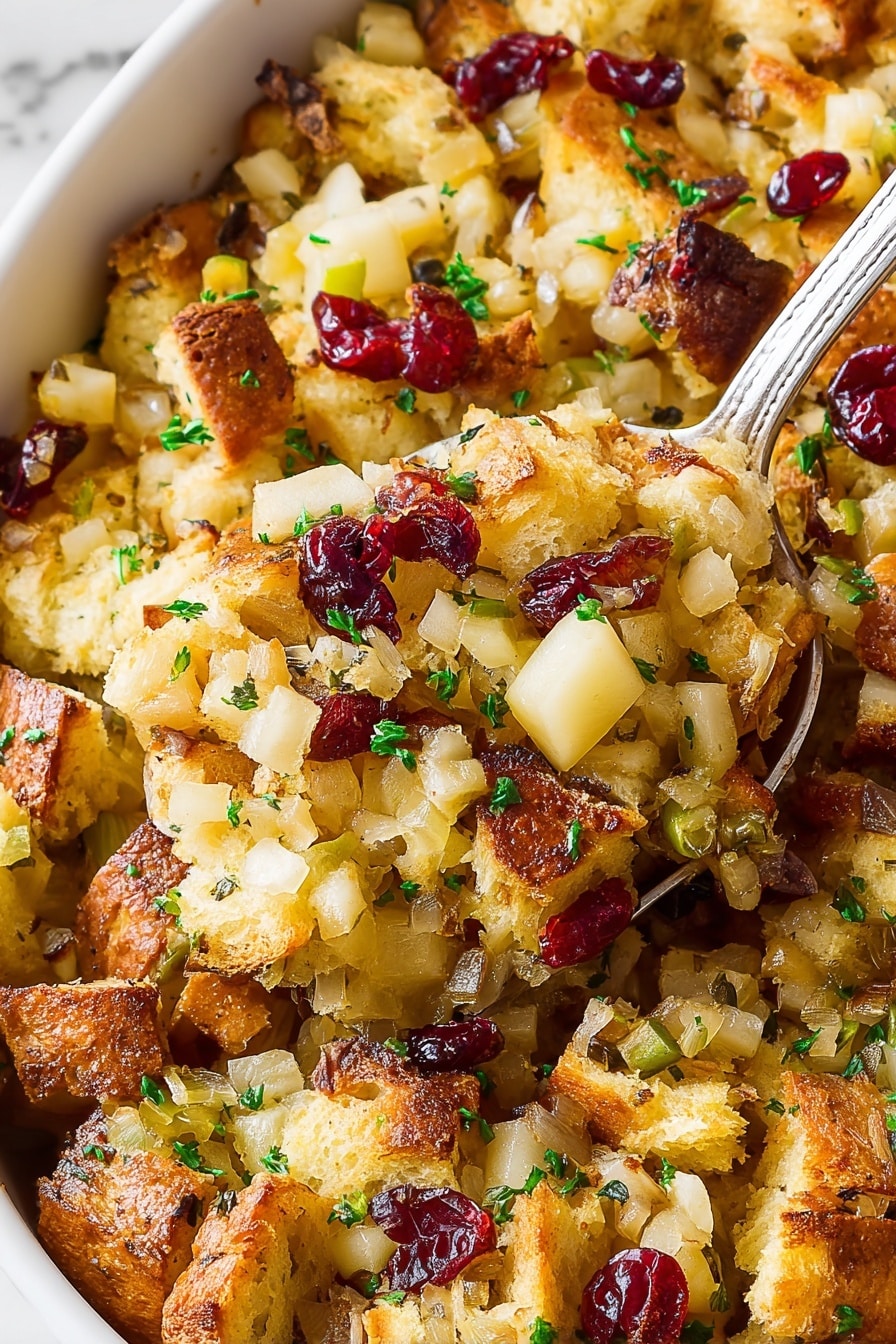 This Cranberry Stuffing Recipe is a delicious and festive side dish perfect for holiday meals. Featuring sourdough bread cubes combined with sautéed apples, celery, onions, fresh herbs, and dried cranberries, this stuffing is moist and flavorful with a perfect balance of savory and sweet. It’s baked to golden perfection, making it a comforting addition to your Thanksgiving or Christmas table.