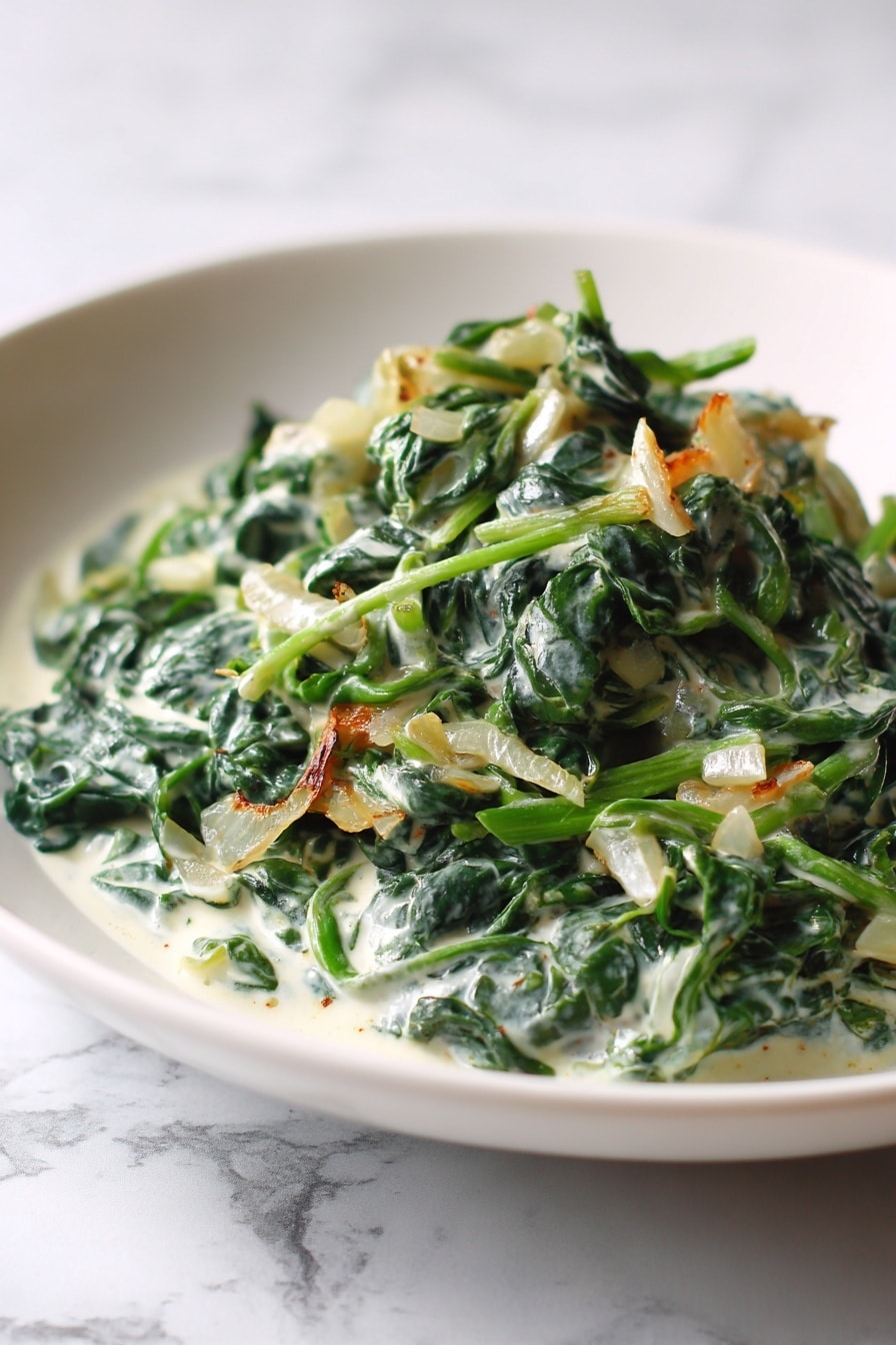 This classic Creamed Spinach recipe features fresh spinach steamed to perfection and combined with a rich, creamy sauce made from butter, onions, milk, cream, and Parmesan cheese. Perfect as a comforting side dish, it delivers a luscious, velvety texture with a subtle cheesy flavor that complements any main course.