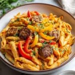 This One Pot Creamy Cajun Sausage Pasta is a flavorful and comforting dish featuring smoky andouille sausage, sautéed mushrooms and bell peppers, and gluten-free penne pasta simmered in a rich, creamy Cajun-spiced sauce. Ready in just 30 minutes, it’s perfect for a hearty weeknight dinner with minimal cleanup.