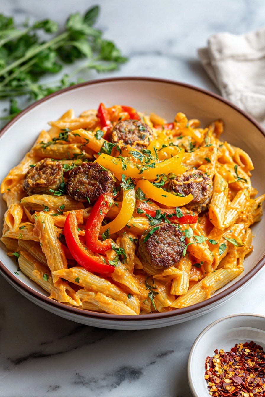 Finally, fold the sausage back into the creamy pasta, sprinkle salt to taste, and give it one last big stir. If you’re anything like me, a handful of fresh chopped Italian parsley and a pinch of red pepper flakes are a non-negotiable finishing touch—they add freshness and a little heat pop. Then, dig in and enjoy!