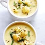 This Creamy Cauliflower Soup is a comforting and velvety dish perfect for chilly days. Made with fresh cauliflower, sautéed onions and garlic, and simmered in vegetable stock, it is blended to a smooth consistency and enriched with milk and Parmesan cheese. Garnish options like sautéed cauliflower florets and roasted chickpeas add delightful textures and flavors making this soup both nutritious and satisfying.