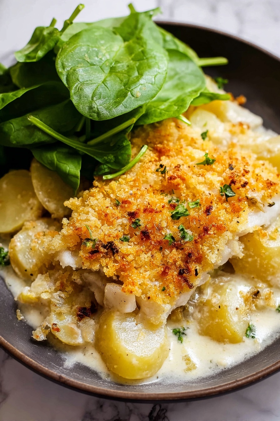 This Creamy Fish on Potato Gratin recipe features delicate white fish fillets baked on a luscious leek and garlic potato gratin, topped with a crunchy parmesan-panko crust. The dish is gently simmered with white wine and cream for a rich, comforting meal that stays succulent and full of flavor. Perfect for a dinner that pairs simple ingredients with classic French-inspired techniques.