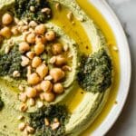 I swear by a combo of roasted sesame seeds, reserved whole chickpeas, a drizzle of olive oil, and a small spoonful of pesto on top. Not only does it make the dip look gorgeous, but it adds little bursts of toasted nuttiness and fresh herbs with each bite.