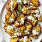- Garnish and Serve: Once baked and crispy, garnish the potatoes with fresh rosemary sprigs on the platter or chopped parsley or cilantro. Drizzle with the garlic feta sauce or serve it on the side for dipping.