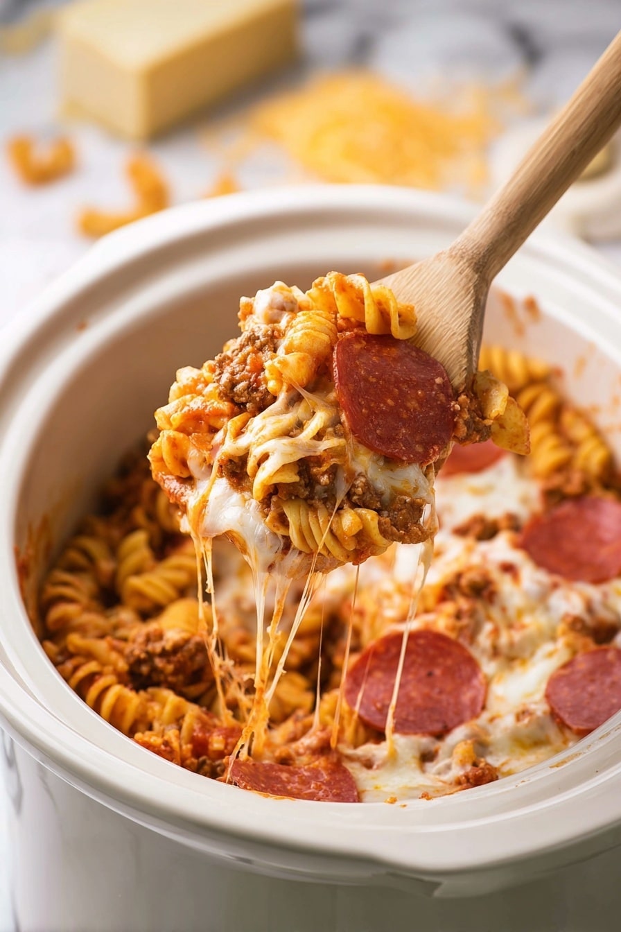 This Crock Pot Pizza Pasta combines hearty Italian sausage, zesty pepperoni, and a rich tomato sauce layered with melted mozzarella cheese all cooked slowly in a crock pot for a comforting and easy weeknight meal loved by the whole family.