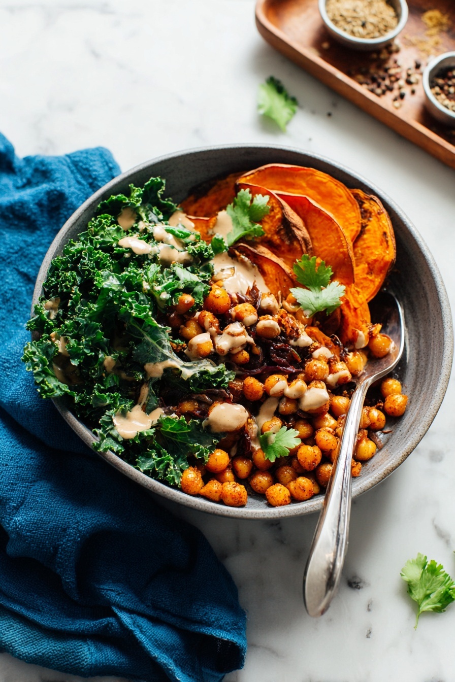 While your sheet pan goodness finishes baking, prep your greens—either steam some kale or massage it with lemon juice and olive oil if you prefer it fresh and tender. Divide the greens between plates, top with your roasted veggies and chickpeas, then drizzle tahini or your favorite dressing on top. Add a sprinkle of sesame or hemp seeds, fresh cilantro, and a squeeze of lemon for a little extra joy. Trust me, it makes all the difference!