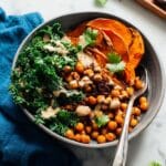 - Assemble and Serve: Divide the kale between plates, then top with the roasted sweet potatoes, cabbage, and chickpeas. Drizzle with tahini or your choice of dressing. Garnish with sesame or hemp seeds, cilantro, and lemon wedges if desired.