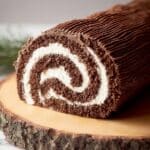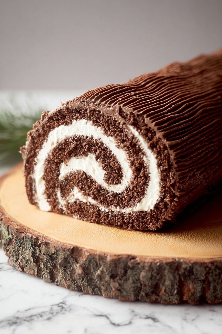 This traditional Holiday Yule Log Cake (Bûche de Noël) features a light and fluffy chocolate sponge cake rolled with whipped cream filling and topped with a decadent whipped chocolate ganache. Perfect for festive celebrations, this elegant dessert combines delicate textures and rich chocolate flavor, decorated to resemble a rustic log.