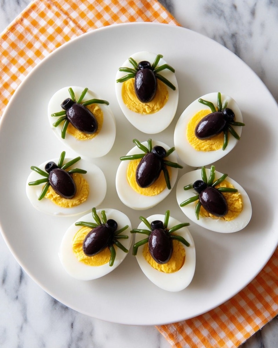 These ingredients come together in a beautiful balance—the creaminess of the yolk filling, the tang from Dijon mustard, and the briny hit from olives that turn into spider legs. When shopping, look for good-quality eggs and flavorful olives—they really make a difference.