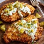This Best Dill Pickle Chicken Recipe features tender boneless skinless chicken breasts coated with a flavorful blend of spices, topped with creamy dill pickle ranch dressing, Parmesan cheese, and crispy breadcrumbs, then air fried to perfection. Garnished with fresh dill, this quick and easy dish brings a tangy and savory twist that the whole family will love.