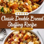 A savory and comforting Double Bread Stuffing recipe featuring a mix of homemade cornbread and sourdough bread cubes, enriched with crispy bacon, sautéed aromatics, fresh herbs, and a luscious brown butter sauce. Perfectly baked until golden and crispy, this stuffing brings a delightful texture and deep flavor to any holiday or special occasion meal.