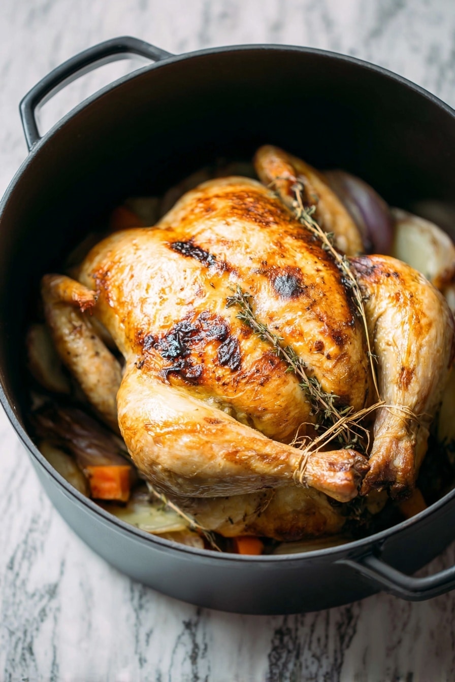 Once out of the oven, let the chicken rest in the Dutch oven for at least 10 minutes. This resting period is crucial because it lets the juices redistribute, ensuring every bite is juicy and tender. While resting, the chicken will carry on cooking thanks to residual heat, so don’t skip this step.