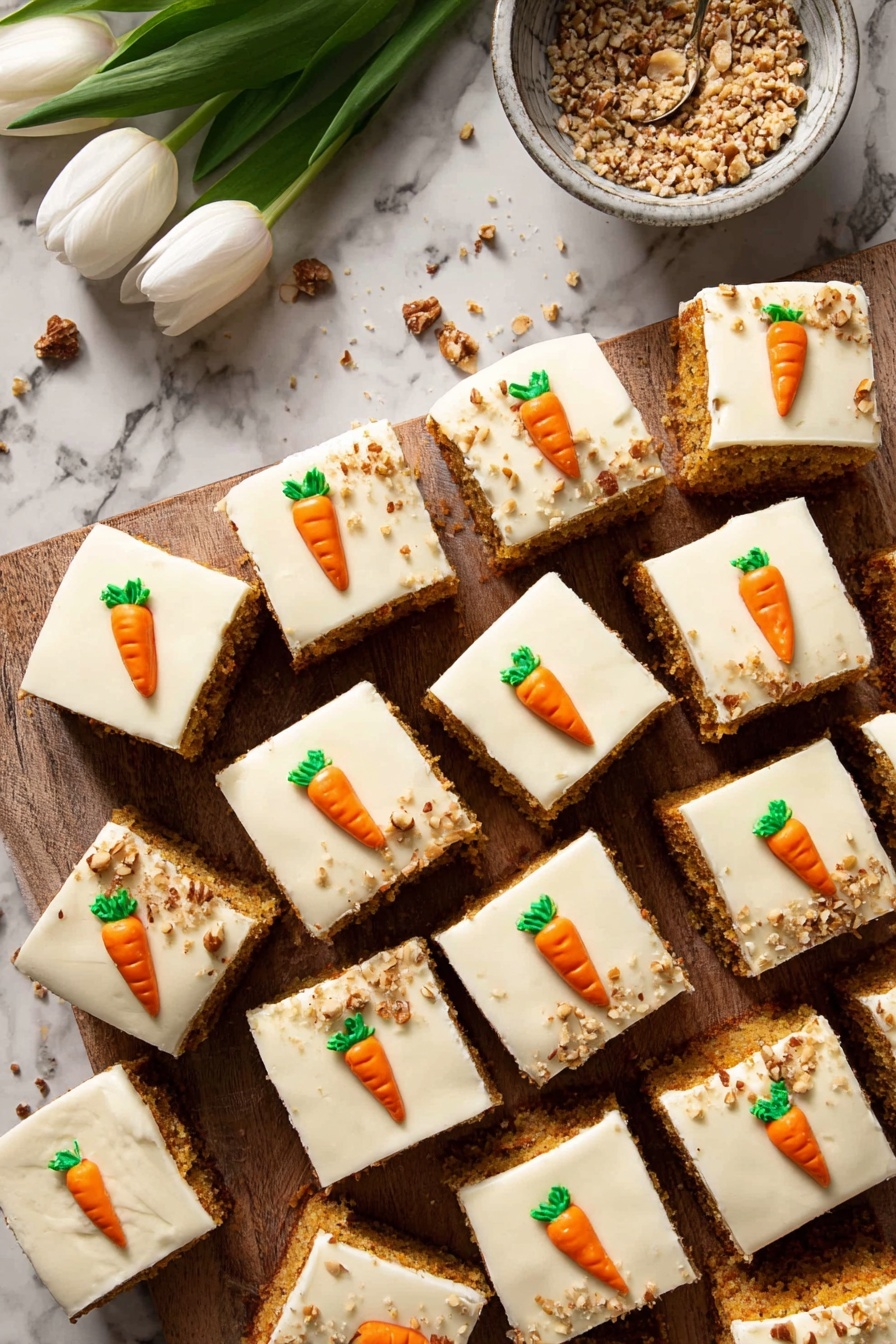 18. Add Nuts and Serve: Sprinkle chopped walnuts or pecans over the cake for extra texture and flavor. Slice into 16 squares if desired for easier serving and to help with positioning the carrot decorations. Serve and enjoy!