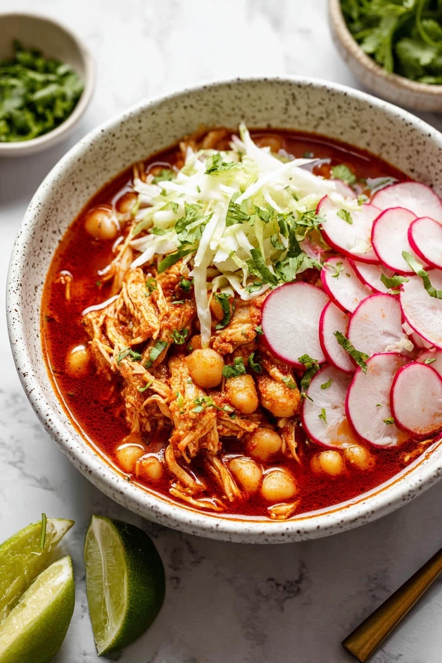 This easy Chicken Pozole recipe is a comforting Mexican stew featuring tender shredded chicken simmered in a flavorful broth enriched with authentic red enchilada sauce and hominy. Prepared effortlessly in a slow cooker, it delivers a rich, hearty dish perfect for family dinners or gatherings. Garnished with fresh cabbage, cilantro, radishes, and lime, this pozole offers vibrant flavors and textures that celebrate traditional Mexican cuisine.