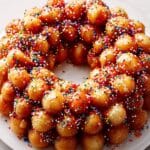 While your struffoli cool a bit, microwave the honey until it loosens up—about 30 seconds usually does the trick—then stir in fresh orange juice to give this glaze a zesty punch. Toss the fried dough balls in a large bowl with the honey until they’re all shiny and coated. Now for the best part: forming the wreath. Spray a tall drinking glass with cooking spray and place it on your serving platter as a mold. Using a slotted spoon, pile the struffoli around the glass in a neat wreath shape, drizzle any extra honey over the top, and sprinkle with festive rainbow nonpareils if you like. Let it rest for about 30 minutes so the honey firms up a bit—then carefully remove the glass and admire your beautiful creation!