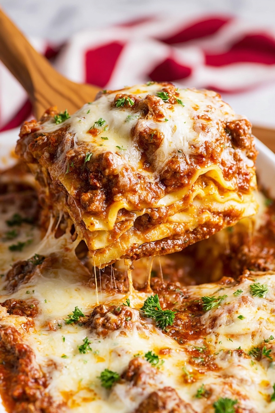 I usually finish my lasagna with a sprinkle of fresh chopped parsley or basil for a bright color and fresh herb flavor—plus a bit of extra grated Parmesan for cheesiness. A crack of black pepper on top just before serving adds a nice touch, too.