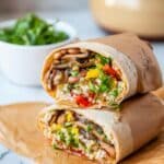 - Assemble Burritos: Lay out a tortilla and place a portion of rice & beans slightly below center. Top with sautéed fajita vegetables and sprinkle chopped cilantro leaves on top. Roll the burrito tightly and wrap it in parchment paper for storage.