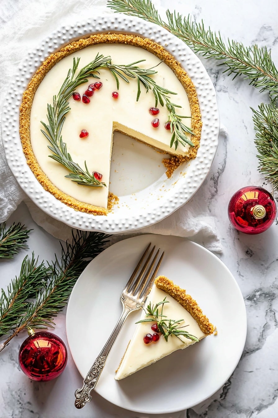 - Serve and Decorate: Remove the metal collar from the springform pan, slice the cheesecake, and serve. Optionally, garnish with pomegranate seeds and fresh rosemary to add a festive holiday touch.