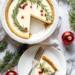 - Serve and Decorate: Remove the metal collar from the springform pan, slice the cheesecake, and serve. Optionally, garnish with pomegranate seeds and fresh rosemary to add a festive holiday touch.