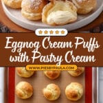 Delight in these festive Eggnog Cream Puffs featuring light and airy choux pastry filled with a rich and creamy eggnog-infused custard, topped with a smooth blend of whipped cream for an irresistible holiday treat.