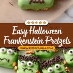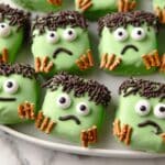 Frankenstein Pretzels are a fun and festive treat perfect for Halloween or any spooky occasion. These sweet and salty snacks feature square pretzels sandwiched with creamy peanut butter, coated in green-tinted white chocolate, and decorated with candy eyes, chocolate sprinkles for hair, and mini pretzel ears, finished with a chocolate mouth for an adorable Frankenstein monster appearance.