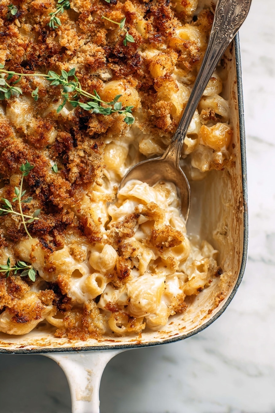 I always sprinkle fresh thyme on top just before serving—its bright, slightly minty flavor really cuts through the richness. Sometimes I add a little extra cracked black pepper or a tiny drizzle of good olive oil for shine and depth. Don’t skip the crunchy breadcrumb topping; it’s the perfect savory contrast to the creamy sauce and melt-in-your-mouth pasta.