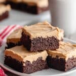 If you want to freeze them, I recommend freezing the brownies without frosting first. Wrap them tightly in plastic wrap and place in a freezer-safe container for up to two months. When ready to enjoy, thaw in the fridge, then make and spread the coffee frosting fresh for best results.