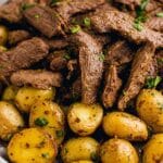 This Garlic Butter Steak and Potatoes Skillet is a flavorful and hearty one-pan meal featuring tender marinated steak slices sautéed to perfection alongside crispy, golden baby potatoes all tossed in a fragrant garlic butter sauce infused with fresh herbs. It’s perfect for an easy yet impressive dinner.