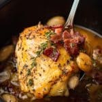- Add Bacon, Thyme, and Garlic: Sprinkle the crispy bacon pieces, dried thyme, and all 40 peeled garlic cloves over the chicken in the slow cooker.