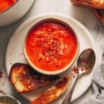 This Super Garlicky Tomato Soup with Smashed White Beans is a rich, comforting vegan soup bursting with robust garlic flavor, creamy white beans, and tangy tomatoes, balanced with a hint of sweetness from maple syrup and smooth coconut milk. Perfect for a cozy meal, it is naturally plant-based and can be served with vegan parmesan and a grilled cheese sandwich for an elevated experience.