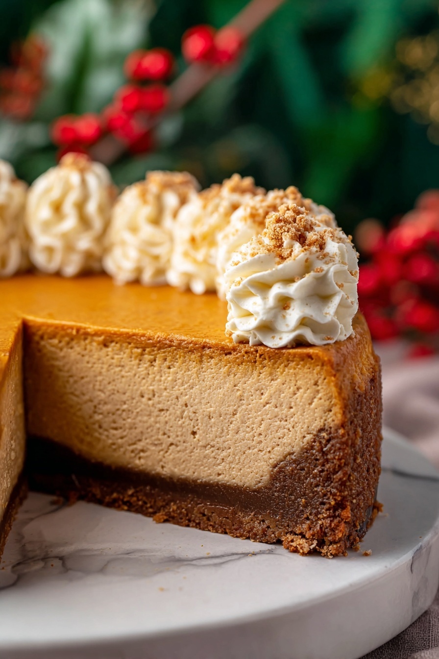 I love keeping it classic with lightly sweetened whipped cream spiked with a hint of cinnamon and vanilla. Gingerbread men cookies or crushed spiced nuts sprinkled on top add the perfect festive crunch. Sometimes, I drizzle a little caramel sauce or a dusting of extra cinnamon for a pretty finish that makes the cheesecake irresistible.
