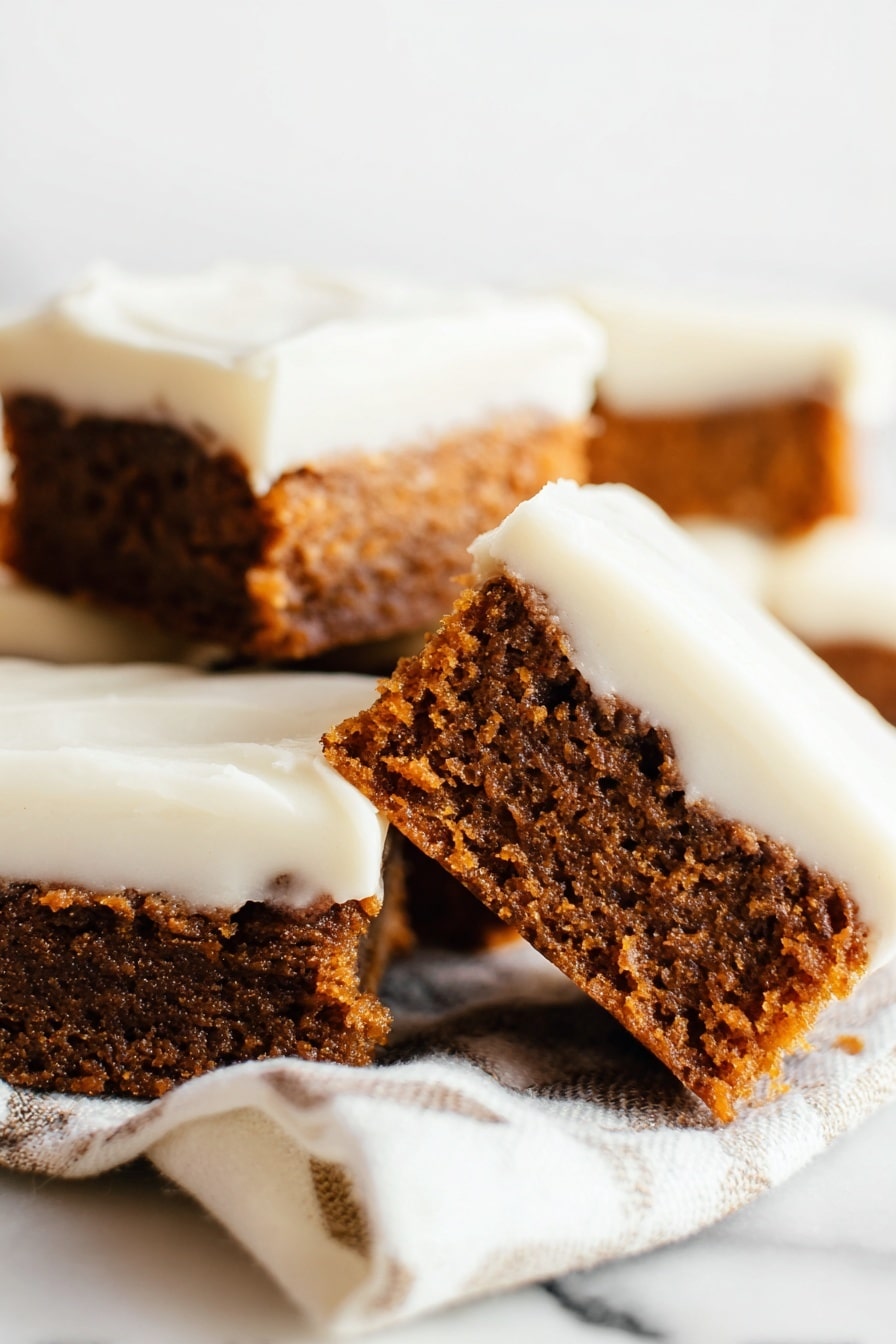 While the bars are cooling, it’s time to make that dreamy frosting. In a stand mixer fitted with the paddle attachment, beat cream cheese, butter, and vanilla on medium-high speed until light and creamy. Gradually add powdered sugar on low speed, then crank back up and beat until fluffy. Sifting the powdered sugar beforehand helped me avoid any lumps—totally worth it. Spread the frosting evenly over the cooled gingerbread bars, then slice into squares.