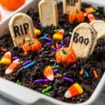 Scatter your candy corn, pumpkin candies, and festive sprinkles around the scene. This adds a pop of color and whimsy that’s just perfect for Halloween vibes. Voilà, your graveyard is ready to haunt the snack table!