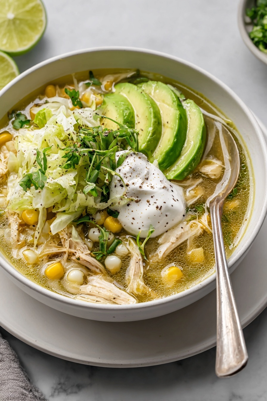 A hearty and flavorful Green Chile Chicken Pozole recipe featuring tender chicken thighs simmered in a spiced broth with hominy, green chiles, and fresh vegetables. This comforting Mexican-inspired soup is perfect for a nutritious meal and is garnished with crisp cabbage, creamy Greek yogurt, avocado slices, and lime wedges for a bright finish.