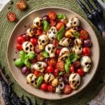 Celebrate Halloween with this spooky and delicious Halloween Caprese Salad featuring mozzarella skulls and dark cherry tomatoes, tossed in balsamic vinegar and olive oil, and garnished with fresh basil leaves. Perfect for a festive appetizer that’s both visually striking and flavorful.