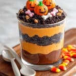 These Halloween Dirt Cake Cups are a fun and festive no-bake dessert perfect for Halloween parties. Layers of creamy chocolate and orange-colored vanilla pudding are combined with crushed Oreos, gummy worms, and festive pumpkin candies for a spooky treat that’s as delicious as it is visually appealing.
