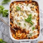 This Healthy Baked Ziti is a flavorful Italian-inspired casserole featuring tender ziti noodles, lean ground turkey sausage, sautéed vegetables, and a delightful blend of marinara and vodka sauces. Mixed with cottage and parmesan cheeses, then baked to bubbly perfection and topped with fresh basil, this dish offers a comforting, nutritious meal perfect for family dinners or meal prep.