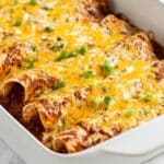 Once out of the oven, sprinkle the chopped green onions over the top for a fresh pop of color and flavor. I love how the sharpness of green onion balances the rich sauce and cheese. Serve these enchiladas hot and enjoy every satisfying bite!