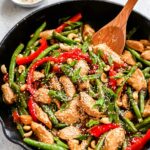 - Cook vegetables and cashews: Add minced garlic, sliced red bell pepper, trimmed green beans, and raw cashews to the pan. Sauté for 4-6 minutes, ensuring green beans retain some crunch.