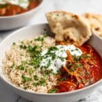 - Serve and Garnish: Serve the chicken tikka masala hot alongside brown rice, pita bread, or naan. Garnish with plain Greek yogurt and chopped cilantro for extra flavor and creaminess. Store leftovers in the refrigerator for up to 4 days.