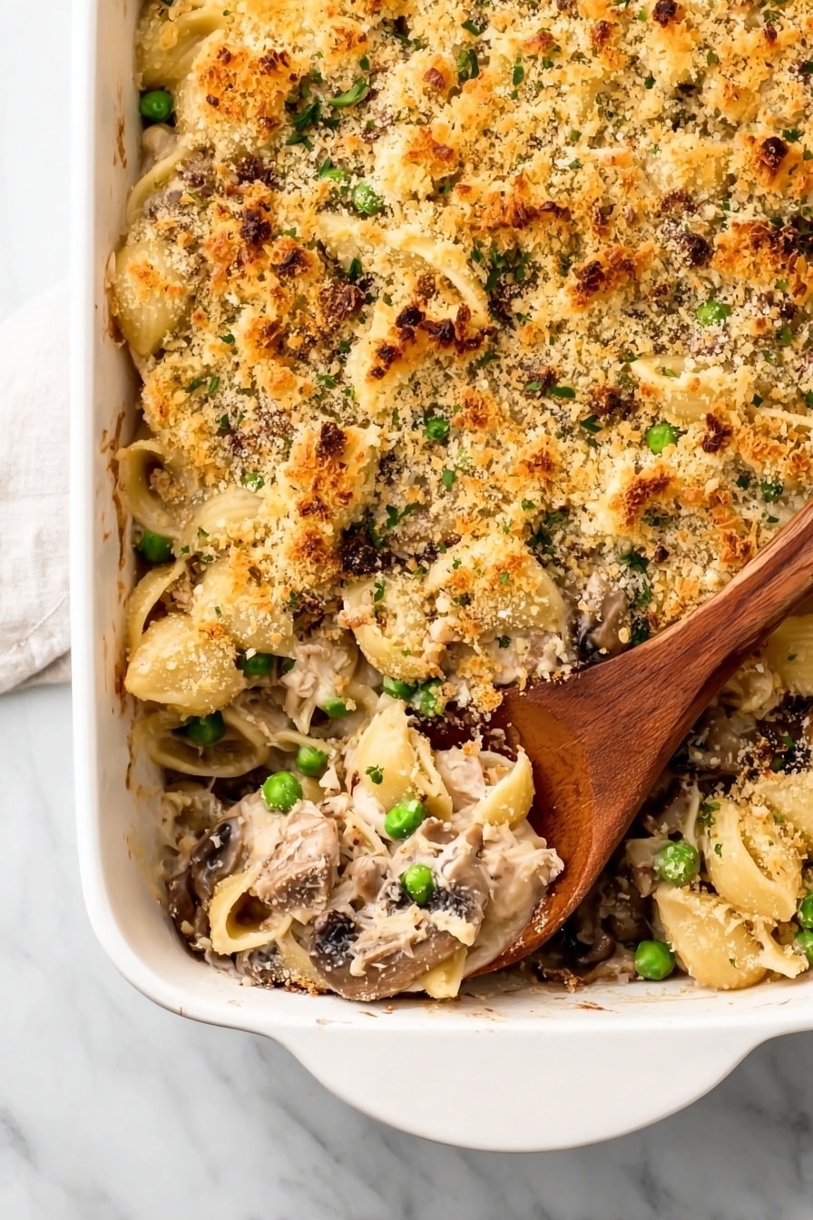 A healthy and comforting Tuna Noodle Casserole full of tender pasta, savory mushrooms, flaky tuna, and peas, all baked in a creamy parmesan sauce topped with a crispy breadcrumb layer. This recipe offers easy modifications for dairy-free and gluten-free diets, making it a versatile weeknight dinner option.