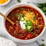 - Serve: After the chili has simmered and the flavors melded, ladle it into bowls. Add your favorite chili toppings such as shredded cheese, sour cream, green onions, or avocado if desired. Enjoy this hearty, healthy chili warm.