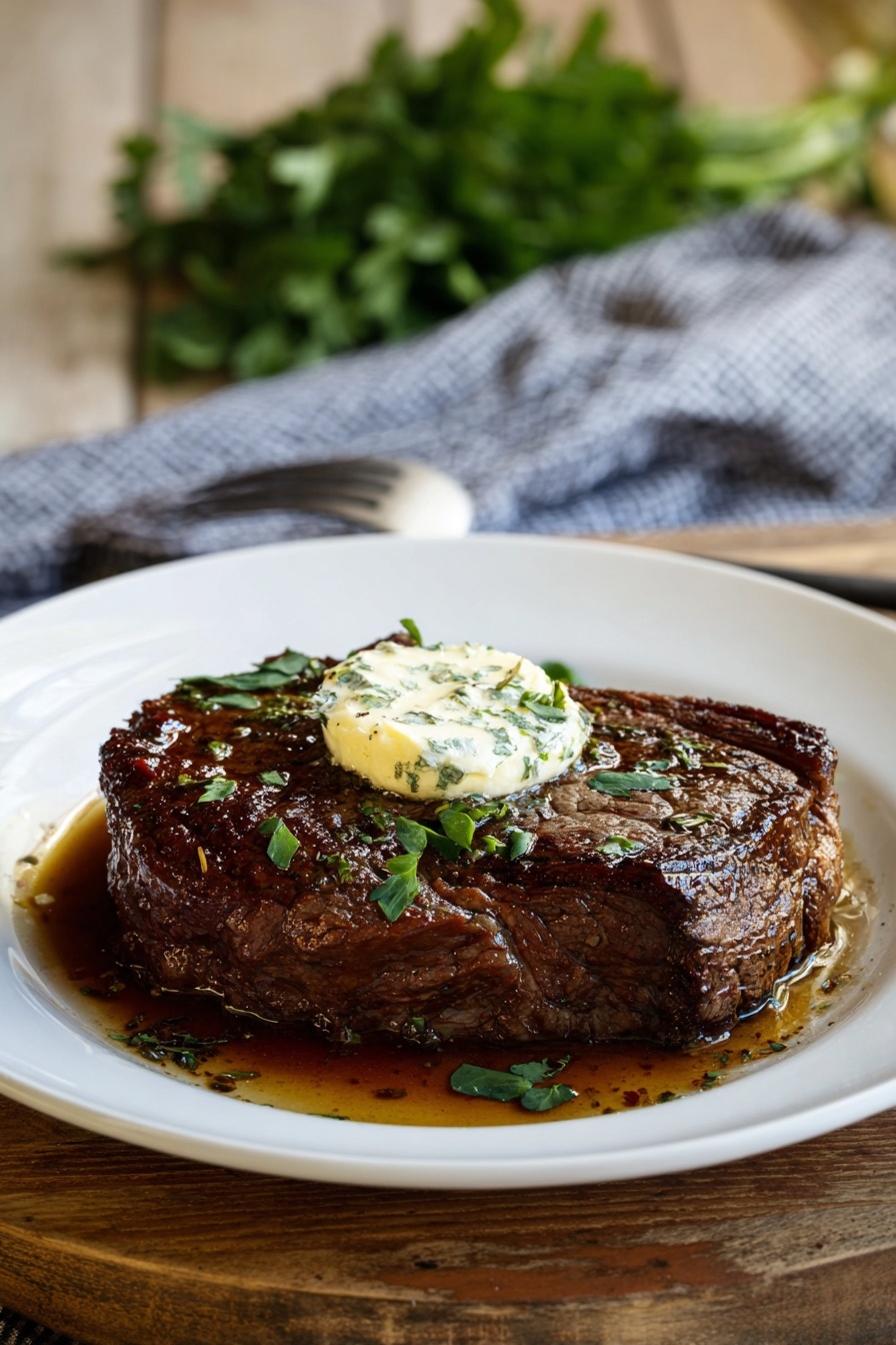 - Rest and Serve: Remove the steaks from the oven and top each with slices of the prepared herb butter. Tent loosely with aluminum foil and let rest for 10 minutes to allow juices to redistribute and the butter to melt into the steak before serving.