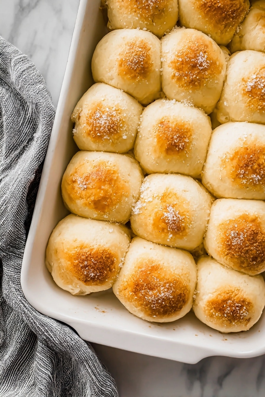After that first rise, give the dough a gentle punch down—like a friendly reminder to wake up—and divide it into 12 equal portions (roughly 2.7 ounces each). Here’s a trick I learned: when you roll each piece into a ball, do it under your palm on a clean surface, moving in small circles to create a nice tight skin. This tight shaping helps the rolls hold their shape and rise beautifully. Arrange your dough balls snugly into a greased 9×13 inch baking dish, cover again with your dish towel, and let them rise for another 15 minutes until puffy. You’ll be amazed at how much they puff up!